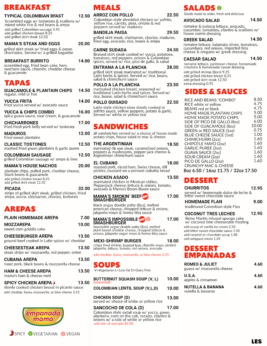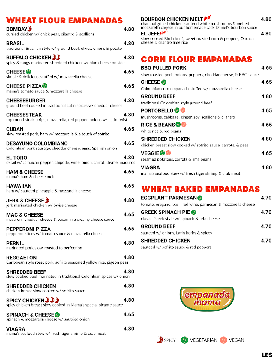 Empanada Mama LES offers a vibrant culinary journey through Latin American flavors, specializing in handcrafted wheat-baked empanadas and hearty traditional dishes. Their menu stands out with diverse fillings like the zesty Spicy Chicken slow-cooked in a signature picante sauce, the savory Cheesesteak infused with Latin spices, and the rich Viagra Wheat, a seafood stew brimming with fresh tiger shrimp and crab meat. Vegetarian options like the Eggplant Parmesan and Greek Spinach Pie empanadas add depth and variety, ensuring there's something for every palate.
